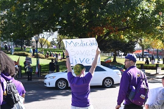 A member of the Service Employees International Union Colorado holds up a sign that reads “Medicaid saves lives” as cars drive by on Lincoln Street just before the “No Kings” protest on Oct. 18, 2025. Michael Braithwaite, The Denver Gazette
