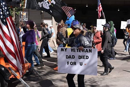 Stacey Everson holding a sign that reads “my veteran dad died for u” while participating in the “No Kings” march through downtown Denver on Oct. 18, 2025. She said she needed a knee replacement due to getting hit by a car, but has been unable to with the government shutdown. Michael Braithwaite, The Denver Gazette