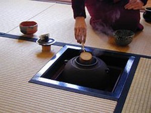 Opening the sliding-door of the service room, the hostess makes a bow before entering the tea-room. It is interesting to observe the elementary lesson of how to bring in the water-jar, which has to be placed in a prescribed position. She leaves the room to reappear immediately, holding the tea-caddy in the right hand and the bowl in the left. She then makes another trip before she sears herself in front of either the stationary hearth, or portable fire-brazier, as the case may be, according to the season.