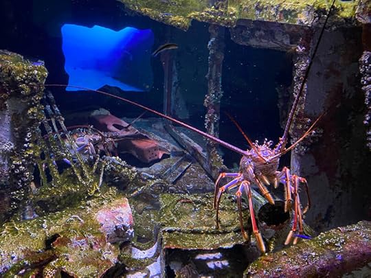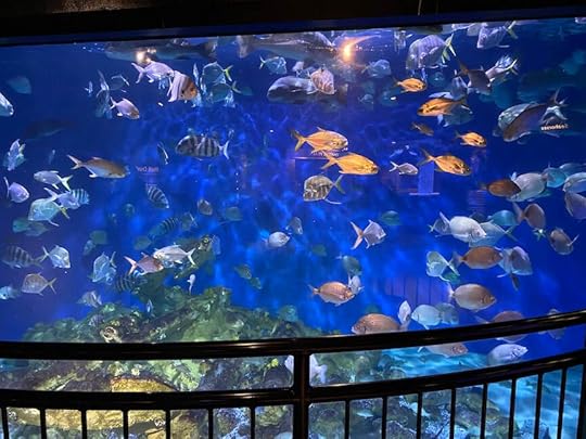 Entrance Sculpture, North Carolina Aquarium, Pine Knoll ShoresI almost roll up my sleeves at the aquarium's touch tank because my characters have a light-hearted encounter there, and I want to experience it. But I chicken out when those beady-eyed creatures glide by me. I can not bring myself to tap a squishy sting ray.