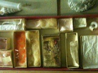 “Here it is, the whole thing’s Huon Pine,” The lady explained. As she opened the drawers the smell of my century poured out and I tried to breathe it in like it was snuff. The cabinet contained a great deal more than shells. Small packets of powders in red and white, little viols of dirt… “What is anyone going to do with little bits of dirt like that?” she asked. Fortunately I’d tucked away the very similar glass vial of dirt from his grave hanging around my own neck at that very moment.“Nobody’s really catalogued this properly,” the librarian remarked. “They were basically 19.th century hoarders. Moreton started keeping things even before Cecil carried it on. Moreton was the interesting one, with his photography and everything. Or Mary and her painting! What got you interesting in old Cecil out of all the Allports?” she queried again. “He just seemed to me like the rock who held the family together and lived only to perform his duties to his family, if he had a fun side there’s no record of it. Other than that he eccentrically pottered away collecting stuff in his spare time. What does a novelist do with that?” “It’s hard to explain,” I murmured, running my fingers reverentially over the tiny vials and boxes. Beyond all the tiny containers full of my century my eye was immediately drawn to the small spiral shaped white shell which is identical to the one I found on his grave. When I lay my fingertips on it and felt something jolt through my body. I picked up one of the cowries and held it to my ear. “Did you hear the ocean from the nineteenth century in there?” the librarian joked. “I'm not sure, but one has to check.”