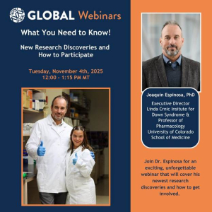For those of you that love someone with Down syndrome, I urge you to sign up and attend the upcoming webinar from the Global Down Syndrome Foundation: New Research Discoveries and How to Participate. Tuesday, November 4, 2025 at 12pm  to 1:15pm MT.  https://www.globaldownsyndrome.org/global-webinars/