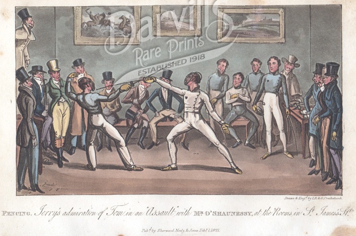 Roman fencer, Madam Collie, showing her skill to Mr. Henry Angelo in his room on Old Bond Street, 1816.John "Gentleman" Jackson & Henry AngeloI will dispense with the biographies of the famous English boxer and the Italian who helped create the sport of fencing because they aren't important here. What is of far greater interest, to writers especially, is the boxing academy Jackson operated; a famous gymnasium style haunt where rich and well connected men learned to box, maintained their fashionable figures, and socialized. It was the country club before country clubs.