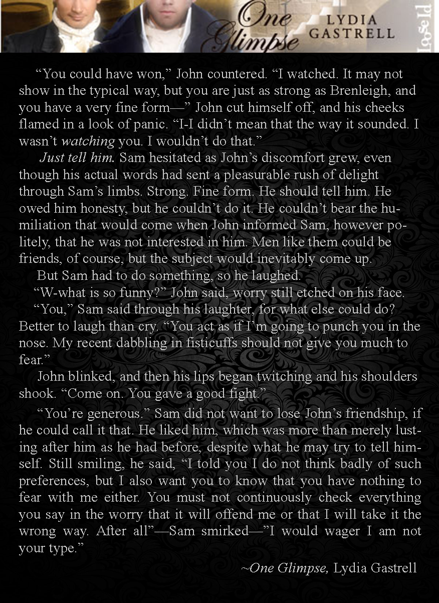 For years Sir Samuel Shaw has secretly lusted after the handsome and popular Lord John Darnish, a man known for his good humor, expert riding prowess, and very female mistress. Certain that John is an unattainable fantasy, Sam is shaken when an accidental discovery reveals John might not be as unattainable as he once thought. But what is possible is not always likely, and Sam finds himself trapped between keeping a friend and risking everything for the unlikely hope of something more.