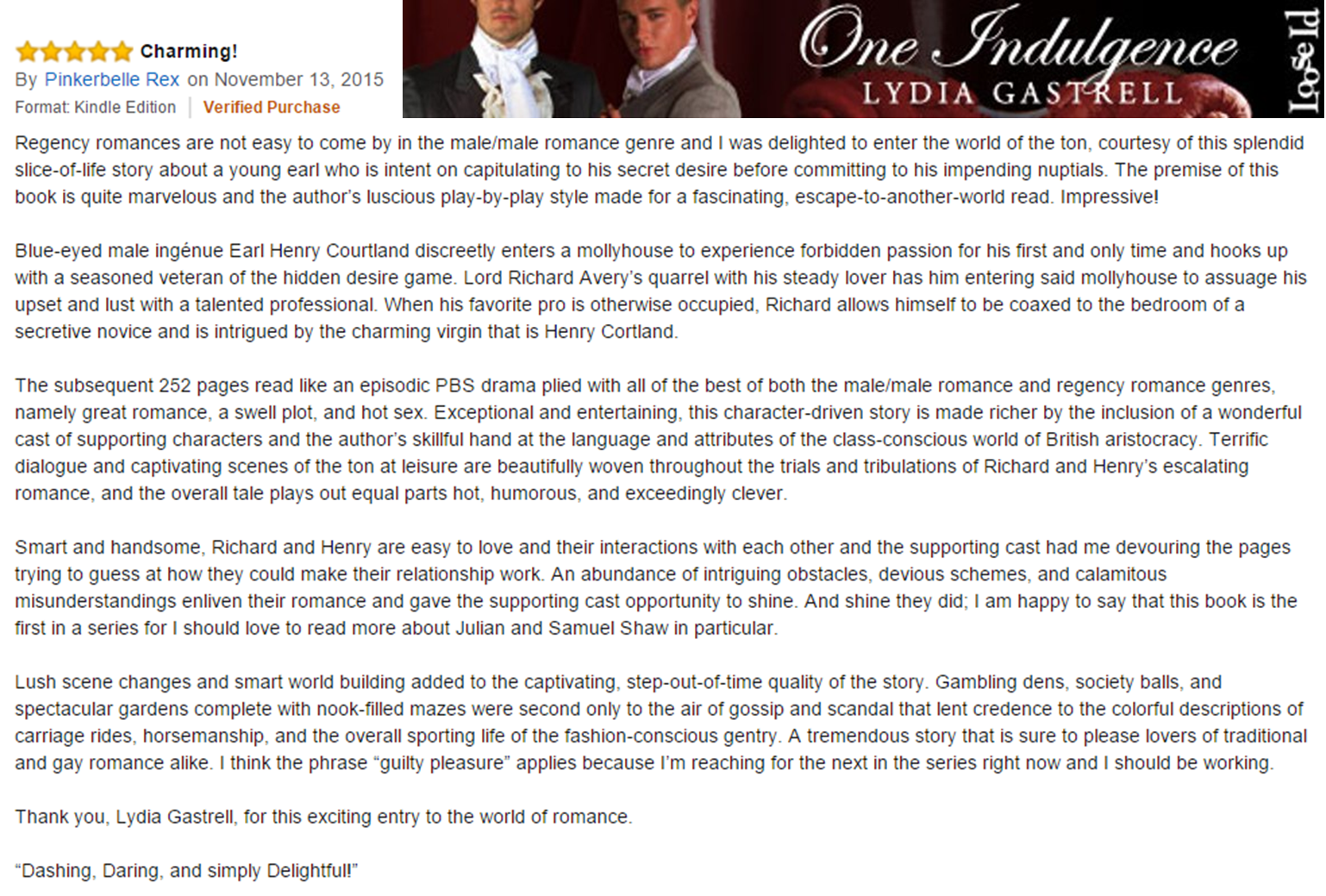 I wanted to thank Pinkerbelle Rex (what a name!) for the amazing review of One Indulgence. Writing is not my first job and I doubt I will ever be able to make it my only job, so it truly is the reviews that "pay" me. Thanks for the wealth, Pink ;) LOL