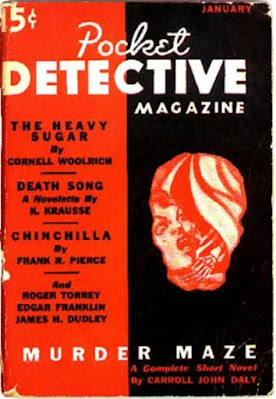 The first story is “The Heavy Sugar” from the January 1937 issue of POCKET DETECTIVE. A down-and-outer in New York City finds a diamond necklace hidden in a sugar bowl in a seedy cafeteria. He figures, correctly, that some crook stashed it there to keep from having the cops find it on him. Our protagonist quickly discovers, however, that having a valuable necklace in his possession is a dangerous thing, since the gang that stole it in the first place is on his trail. As always, Woolrich does a great job depicting a squalid world of bars and flophouses, and he ratchets the suspense up skillfully to a twist ending that I should have seen coming but didn’t.