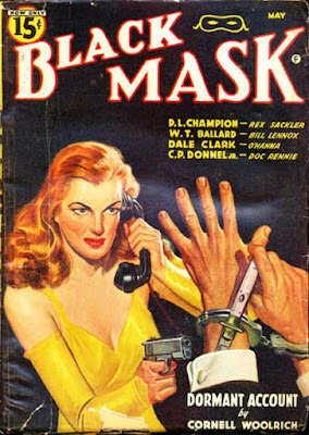 “Dormant Account” appeared in the May 1942 issue of BLACK MASK. The narrator, down on his luck George Palmer, comes up with an unusual way to try to turn his life around. He sees a list of dormant bank accounts in a newspaper and decides to pretend to be one of the people listed who has money coming to them. Through Woolrich’s careful manipulation of the plot, Palmer makes this crazy scheme work, but only up to a point. Then everything falls apart and he winds up running for his life. Once again, Woolrich spins a yarn that seems too ridiculous when you look at it logically. But who looks at a Cornell Woolrich story logically? And since when is life logical? All I know is that I enjoyed this story, and I loved the final twist even though you could see it coming the proverbial mile away.