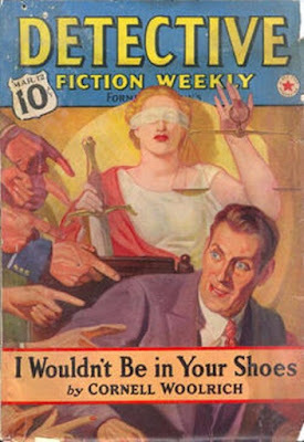 “I Wouldn’t Be in Your Shoes”, from the March 12, 1938 issue of DETECTIVE FICTION WEEKLY, is one of Woolrich’s best-known stories and a prime example of how he could stretch coincidences and unlikely twists into a suspense yarn that gallops along and keeps the reader enthralled. A guy loses his temper and throws his shoes out the window at some yowling cats who are keeping him awake. Then, before you know it, he’s arrested and charged with murder. He’s tried, convicted, and on the brink of execution, his only chance a police detective who comes to believe his wild story. Not only does Woolrich construct a compelling story out of not much more than thin air, he even throws in a couple of entirely logical late twists that give this yarn a really bittersweet ending.
