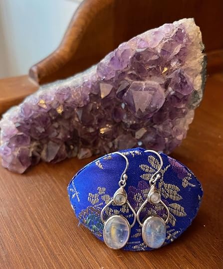 The Powell half of our writing team has had a citrine crystal for decades. Citrine enhances the body’s natural healing. She often holds this smooth, polished stone when she prays or meditates or is looking for peace, insight or strength. She also uses geodes in her home décor (pictured), and moonstones are her favorite earrings (also pictured).
