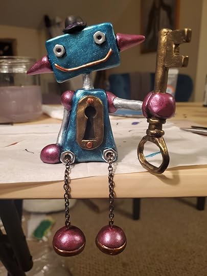 He’s made of polymer clay, wire, chain, foil, metal nuts, and acrylic paint.
