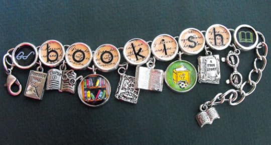 Bracelets make up the bulk of the site, featuring letter charms spelling out phrases such as “Bibliophile”, “Got books?”, and “Wordsmith” accompanied by a variety of book and writing themed dangles. The letter beads are made from old-fashioned replica typewriter keys, often overlaid on text backdrops; the other charms are a combination of pewter book stacks, typewriters, pencils, coffee cups, and other essential tools of the literati, and images from books and documents displayed in base metal charms with glass cabochons. Many bracelets are personalized for those in bookish professions, such…