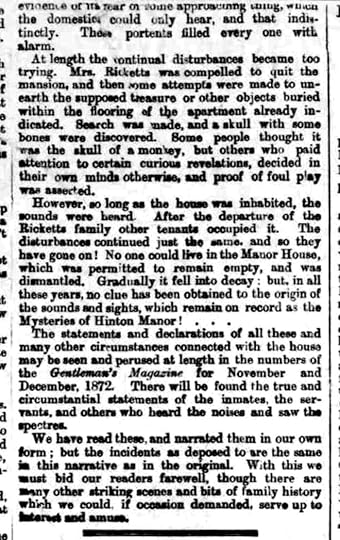 As Frith explains, Hinton Manor (a.k.a. Hinton Ampner) no longer stands. For a fuller account of the haunting and Jervis and Luttrell’s investigation of it, please read the “Purposeless Ghosts: Jervis, Bolton, and Luttrell at Hinton Ampner” chapter in Certain Nocturnal Disturbances: Ghost Hunting Before the Victorians. In the meantime, you might enjoy my post about four prominent cases of a haunting being substantiated by the claim that skeletal remains were unearthed there. It became a minor motif in the Victorian-era ghost reports.