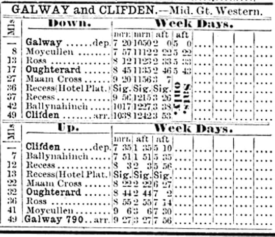 Luckily, another Welsh report adds that those two witnesses were “taking a short cut on the railway line to Galway from Newcastle,” and this is repeated in those papers in the United States and New Zealand. Here’s a much more helpful clue! It suggests our initial witnesses were very likely on the Galway and Clifden Railway, a branch of the Midland Great Western, whose tracks went northwest from Galway while hugging the west bank of the Corrib River. They look as if they would’ve gone fairly close to Newcastle. At least, closer to Newcastle than to Glenville.