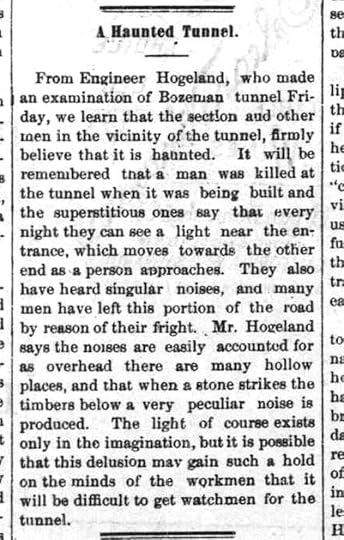 But here’s one set in a train tunnel in the Rocky Mountains, roughly fifteen miles east of Bozeman, Montana. Construction of a tunnel for the Northern Pacific Railroad took place between 1882 and 1884, and a report that it might be haunted appeared in April of 1885. Unlike some of the cases I’ve researched, news of this one doesn’t seem to have traveled very far, not even beyond what was then the Montana Territory. The earliest article I’ve found was in The Bozeman Weekly Chronicle, and this was reprinted in the Helena Weekly Herald about a week later. A week after that, it was summarized in The Billings Herald.