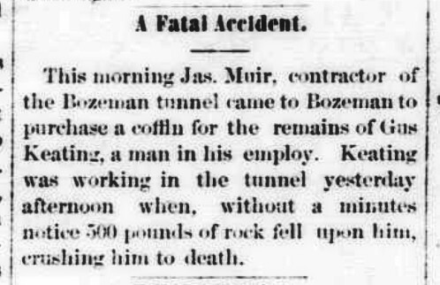 Elsewhere on this page of the November 21, 1883, issue of Bozeman Weekly Chronicle, this victim of the tunnel appears as Pat Keating, not Gus.It seems, then, that at least two men—the unnamed victim of a blast and Mr. Keating—lost their lives during construction of the tunnel. However, this is as much a backstory for a ghost as it is inducement for interpreting weird sounds and a moving light to be of spectral origin.