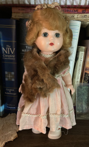 My 7th Christmas, I received a very special doll called, “Little Miss Addie.” She was a promo for AD detergent around 1957, and my mom had to send in a label or box top or something along some money to get her. She came adorned with a little mink stole. I was enraptured with that doll, but she was so fancy my mom wasn’t crazy about me playing with her too much. (Keeping “nice” things nice was a high value of hers.)