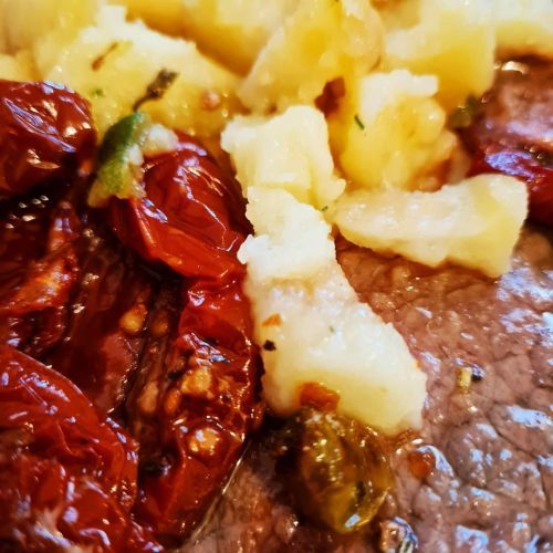 Per chi volesse: bistecchine sottili di scottona (o altro a piacere), pomodori secchi sott'olio e patate ‘pasticciate’.