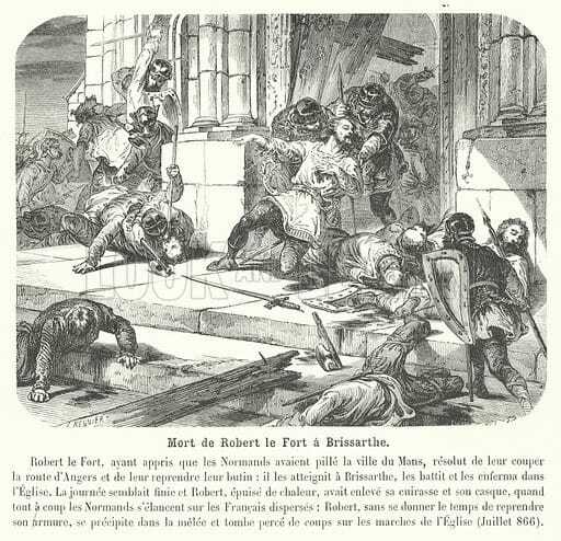 Believing the Vikings were neutralized and exhausted by the heat, Robert and his men began to remove their heavy maille shirts and helmets to rest. It was the opening Hasting and his men needed. In a desperate, explosive sortie, the Vikings charged out of the church. Robert, caught unarmored and unprotected, was struck down in a doorway.