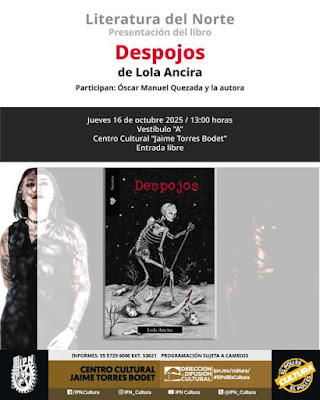Instituto Politécnico Nacional drntposeoS456798ag5tgaoue0u:lm2u ea581. dc9b1m2  9s rm3facuh.5g385l8lf1 769 9 ·#CulturaIPN | 📚No te pierdas la presentación del libro "Despojos", de Lola Ancira. Obra ganadora del Certamen Nacional de Literatura "Laura Méndez de Cuenca". ¡Te esperamos!🖋️🏅📆 Jueves 16 de octubre⏰ 13:00 horasCultura IPN Read more of this blog post »