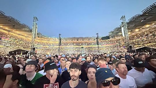 Stadion Croke Park rame banget!Jam 17.00 saya sudah mengantre di gerbang stadion Croke Park. Tiket berupa QR code acak di aplikasi atas nama Ken akhirnya berhasil di-scan. Saya pipis dulu di toilet portable. Masuk ke lapangan, saya berjibaku memilih spot sekitar 5 meter di depan panggung bagian tengah. Di antara ratusan cowok berdiri, tahu-tahu ada dua cewek yang lagi duduk di lantai (lapangan rumput ditutup lempengan aluminium). Saya langsung duduk di sebelah mereka. Kami ngobrol santai, ternyata satu cewek Jerman yang nonton sendiri dan satu cewek lagi orang Italia yang nonton sama suaminya. Saya merasa aman!