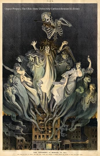 “The tenement—a menace to all,” the tagline says. Death hovers over the triumphant spirits of alcoholism, prostitution, gambling, opium dens, and other social evils, which escape like noxious vapors through the unlit tenement windows.