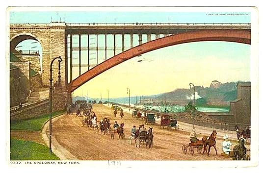 Completed in 1898, the Harlem Speedway followed the western edge of the Harlem River through stretches of Upper Manhattan not yet fully urbanized. The dirt road was closed to cyclists; crowds gathered on a pedestrian pathway to watch the trotters and the men who rode them.