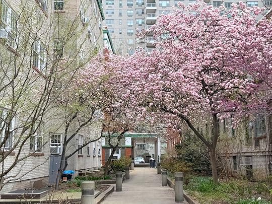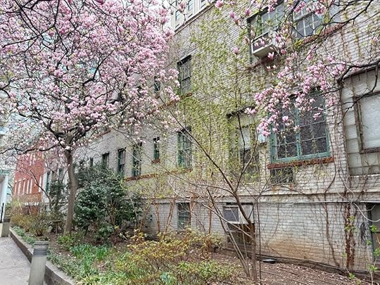 A canopy of pink and white petals overhead, patches of ivy crawling up walls, a couple of bird baths, bushes and flowers budding closer to the ground—it’s the kind of not overly manicured garden that reflects the Village’s historical refusal to adhere to convention (or the street grid).