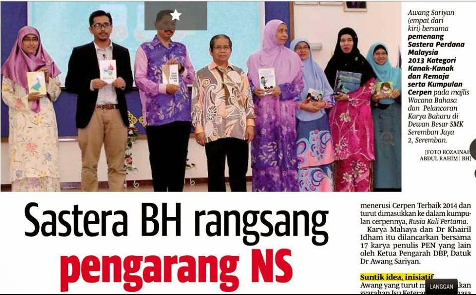 Salam sdr2 :) bersama2 ini, sekali lagi, dgn teramat sgt bangganya, saya menyiarkan gambar cerpen Impian Segunung Intan, hasil karya Sdr Asmah Hasyim kita , yang baru sahaja terbit di majalah WADAH SISWA BIL 16/2014. Utk pengetahuan kita semua, cerpen ini juga telah mendapat bimbingan daripada kelas di blog Sastera kita ni. nanti selepas tempoh bulan terbitnya cerpen ini di ds, dapatlah kiranya asmah terbitkan keseluruhan cerpen utk kita kongsi dan semoga anak-anak didik saya yg lain boleh mendapat inspirasi daripadanya. tahniah asmah :) gigih terus k.