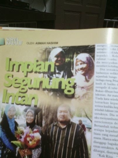 Salam sdr2 :) bersama2 ini, sekali lagi, dgn teramat sgt bangganya, saya menyiarkan gambar cerpen Impian Segunung Intan, hasil karya Sdr Asmah Hasyim kita , yang baru sahaja terbit di majalah WADAH SISWA BIL 16/2014.  Utk pengetahuan kita semua, cerpen ini juga telah mendapat bimbingan daripada kelas di blog Sastera kita ni.  nanti selepas tempoh bulan terbitnya cerpen ini di ds, dapatlah kiranya asmah  terbitkan keseluruhan cerpen utk kita kongsi dan semoga anak-anak didik saya yg lain boleh mendapat inspirasi daripadanya. tahniah asmah :)  gigih terus k.
