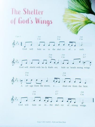 “The Shelter of God’s Wings” is an original song I wrote with some help from my husband. I wrote the words and the melody with the exception of one note that Marc thought could be changed. He added the guitar chords and background arrangement. In the Youtube “video,” that’s him playing the guitar.