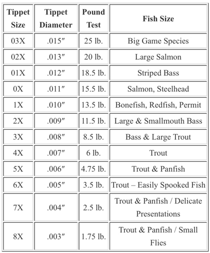 While you may not have to change your leader all that often, you will have to change or replace your tippet material quite a bit. Naturally, you’ll want to use lighter tippet for fishing with small flies and larger tippet for bigger flies and bigger fish. Just as with leaders, tippet material comes in species-appropriate sizes and strengths. It’s also important to note that some leader and tippet materials float, such as nylon monofilament, which is a good choice for dry flies that float on the surface of the water, and some materials sink, such as fluorocarbon, which is good choice for nymphs, micro jigs, and other sinking flies. Leader and tippet materials are generally standardized with a numeric “X” system to designate the size and strength. Here’s an example…
