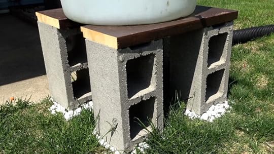 After getting my barrels and washing them out good, I set up an elevated stand for each one so I can get buckets under them to easily fill up as well as to better utilize gravity when attaching a hose. I was originally going to build my stand from some treated lumber, which is very expensive at the moment, so I decided on some cinder blocks instead, which cost me less than two bucks apiece. The ground was a little uneven where I set up my stands, so I used some gravel to level things up and simply put a couple of scrap boards across the blocks.