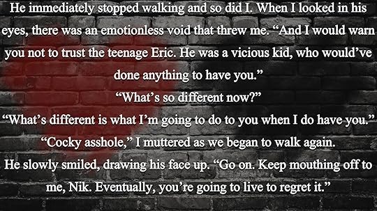 Eric Brenton, Nikki’s new neighbor, lives in a dark, chaotic world that is easily hidden behind his model good looks and cocky demeanor. Unapologetic about his dirtier intentions, he sets his sights on Nikki with an offer to help her. But his help comes with very unorthodox conditions and a huge price.
