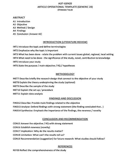 3. Aku cadangkan .... utk PG merujuk kpd template AOT aku (foto 2) dgn 20 perkara yg perlu ada dlm artikel dan komen 20 elemen ini. Contohnya... adakah artikel menyatakn reka bentuk kajian dan boleh tak reka bentuk mjawab persoalan kajian. At least tak adalah terkial2 apa nk di analisis...