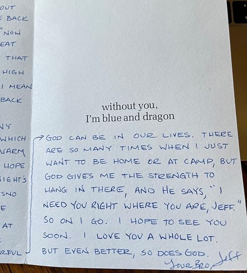 I hope even more that you are learning how powerful God can be in our lives. There are so many times when I just want to be home or at camp, but God gives me the strength to hang in there, and he says, “I need you right where you are, Jeff.” So on I go. I hope to see you soon. I love you a whole lot. But even better, so does God.