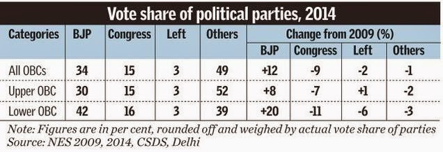 Sarang's conceptualization, irrespective of its accuracy, is fascinating and has far-reaching implications for literary studies in India. It is interesting how he changed the title of his essay from ' OBC' Yug (2007) to ' Madhyam Varniya' ( of Middle Varna) in his collection in 2011, probably to avoid controversy. However, some questions need to probed further. For instance, why did the OBCs stay away from Dalit politics and poetics? What was the impact of the Mandal Commission implementation and the rise of OBCs as a force in Indian politics on the way Indian literature was read and written? What is the impact of the swing of the OBCs towards the erstwhile upper caste party BJP ( see the statistics from the Hindu given below) on cultural politics of India, especially, the identarian ones? Specifically, with the OBC as a Prime Minister who has a thumping support from the upper-castes as well, what will be the trajectory of OBC identity politics in India?