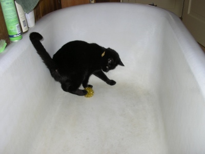 Sawyer begins her transformation.It was time to find a suitable name for the little cat. She had never responded to the name Sawyer, so Carolyn looked for something else more to her personality. One day she was muttering through a string of possibilities, (mostly wine names to go with Pinot). When she said, “Chablis,” Sawyer perked up and turned to look at her. Carolyn feared it was a coincidence, but several hours later, it happened again. So Sawyer became Chablis.