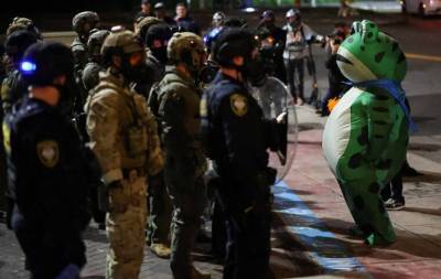 1A demonstrator wearing an inflatable frog costume was pepper-sprayed by a federal agent during a protest outside the US Immigration and Customs Enforcement (ICE) facility in Portland, Oregon early this week. Videos of the incident, which quickly spread on social media, showed the agent aiming spray toward the costume’s air intake valve.