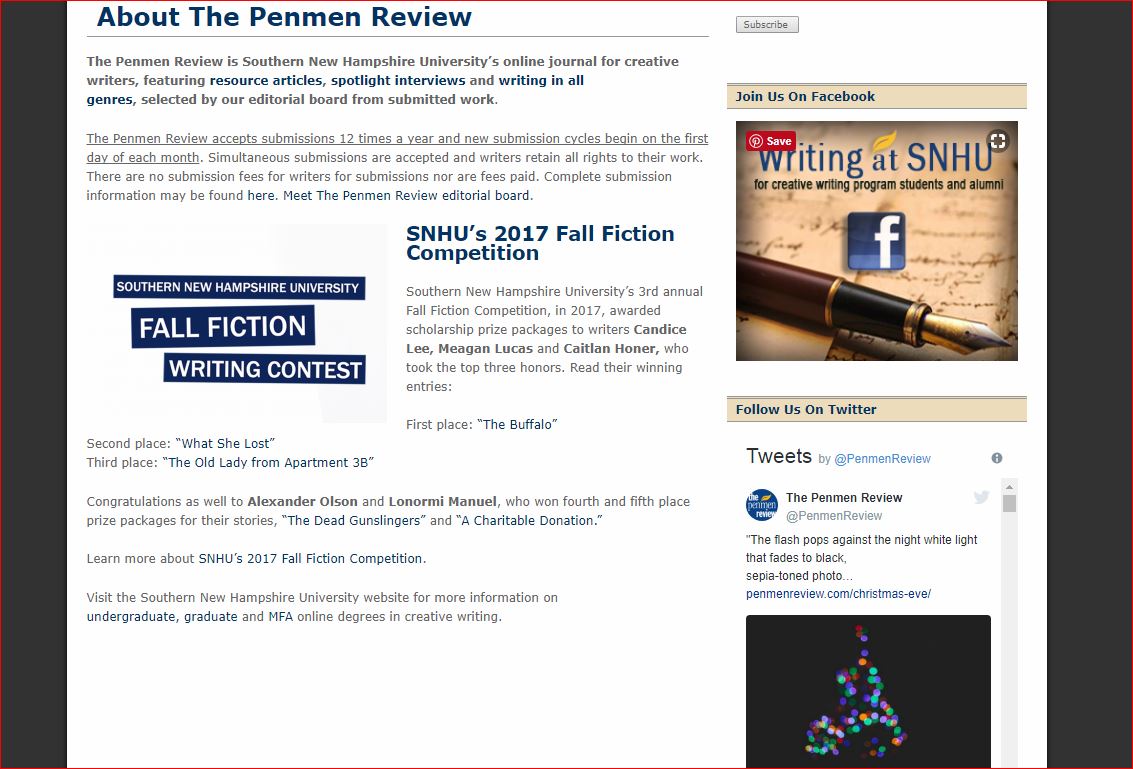 Thanks to all of you who voted for my short story "The Buffalo," which won the first place prize in the Penmen Review's Fall Fiction Competition. #Read about it here http://penmenreview.com/