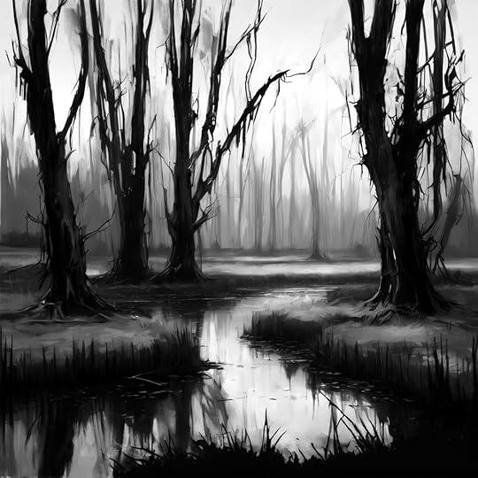 Above, the tree leaves rustle together, their hollow clapping creating an eerie symphony that echoes through the still air. The darkness lies thick and impenetrable behind the marsh forest, an abyss that seems to watch you with unseen eyes. Weeping willows, their drooping branches like the fingers of sorrowful ghosts, loom over the water. Their ancient limbs weave up and down, casting twisted shadows that dance on the surface.