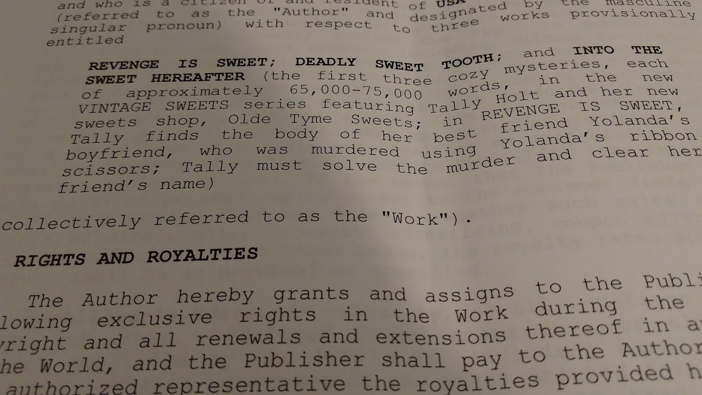 Meanwhile, I’ll go a bit quiet here until I have more info—cover, pub date. I do know the first one will be published in 2018, and I have the first three titles.REVENGE IS SWEETDEADLY SWEET TOOTHINTO THE SWEET HEREAFTER
