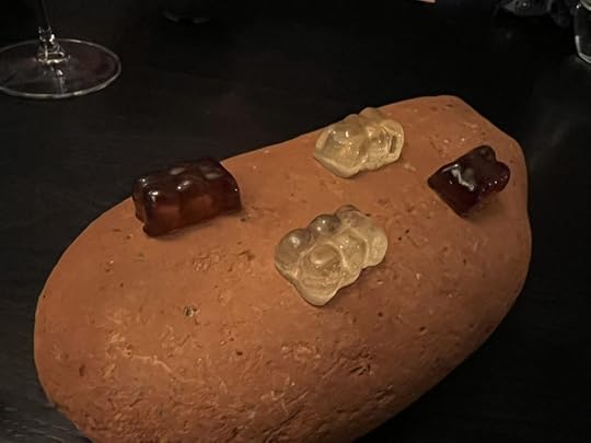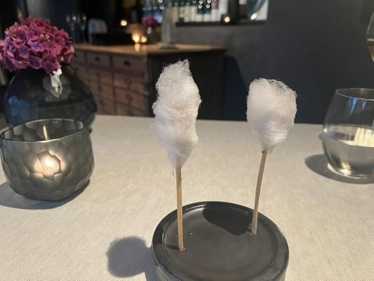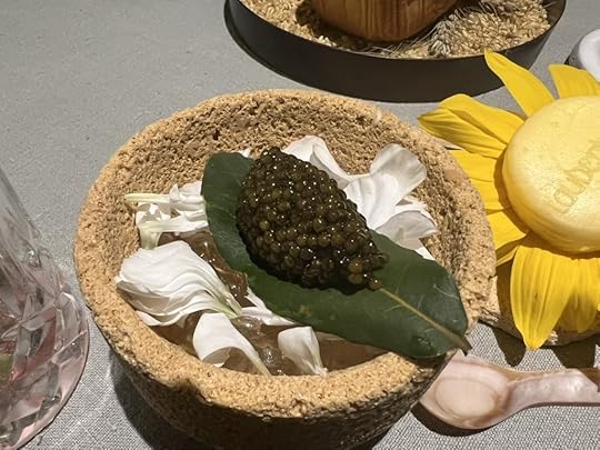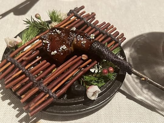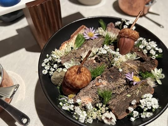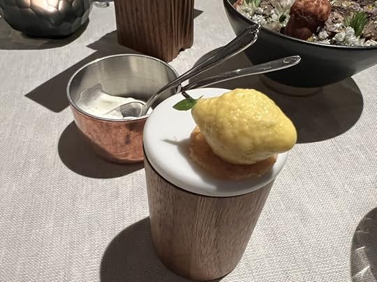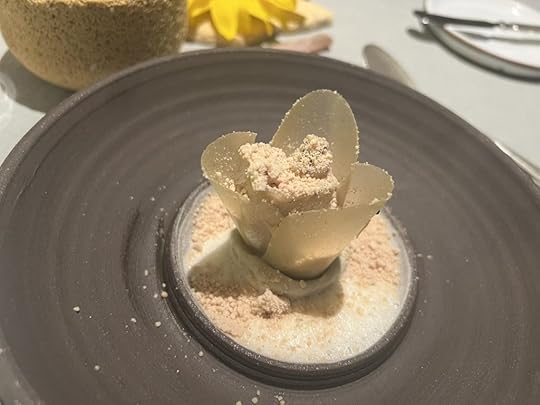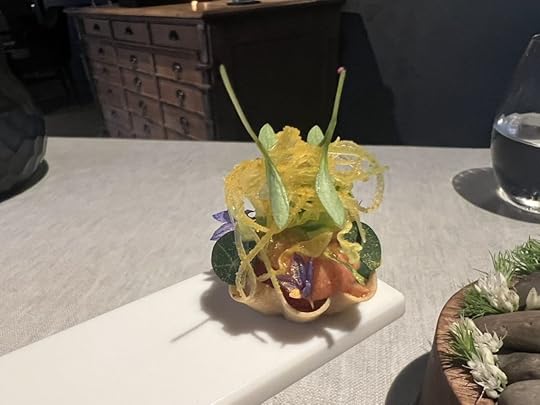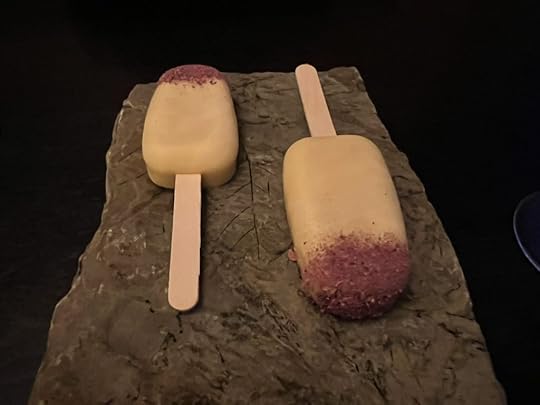 We were next served popsicles of fermented honey with sea buckthorn heart and flowers, and a glass of Mark Angeli Bonnezeaux Coteau du Houet 2004, sweet and floral.