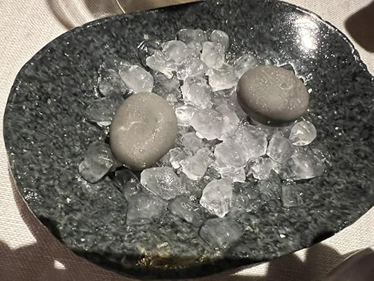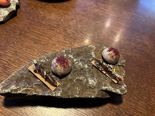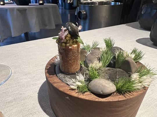 We were served next a palate cleanser, an ice of fermented yellow beetroot with locally foraged mountain sorrel. It was excellent. Fermentation is a necessary method of preservation on Svalbard, and it also gave a zing to the beet.