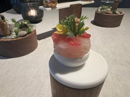 Next came an uni preparation the chef described as urchin panna cotta, with shellfish jelly, Japanese geoduck, Alaskan king crab, Portuguese carabinieros, shiso, grapefruit and Hokkaido sea urchin.
