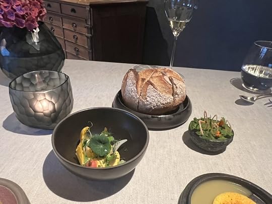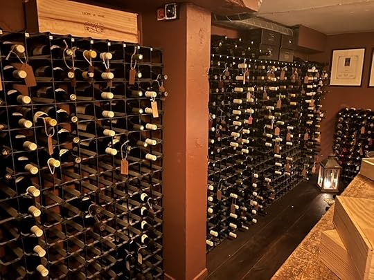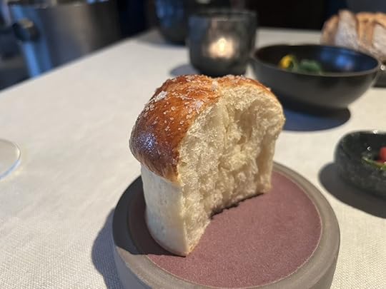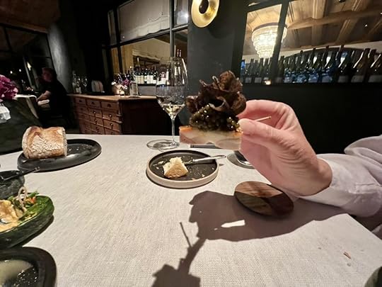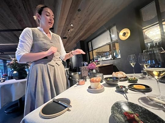Our dinner at Huset was a fourteen-course tasting menu. We were brought glasses of a California sparkling wine as soon as we sat down. I generally choose standard rather than prestige wine pairings, but interested to see what their famous cellar held, I went for their top-level pairing. I was somewhat disappointed to see that only about half of the selection came from their cellar collection and half were recent acquisitions. But nevertheless, there were a good number of wines in the pairing that I especially enjoyed.