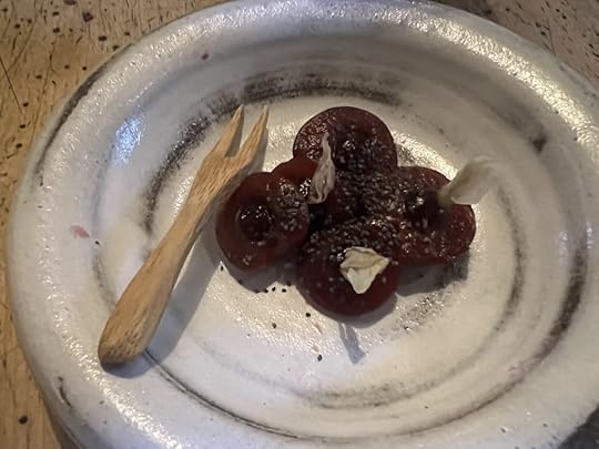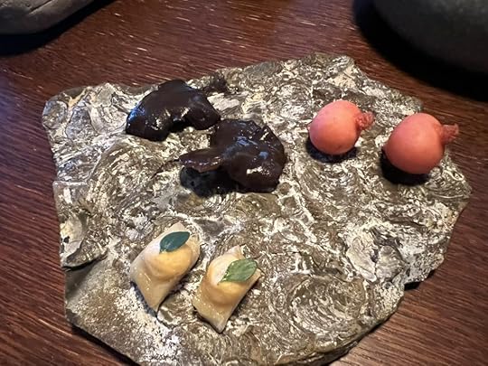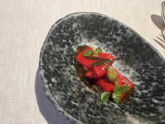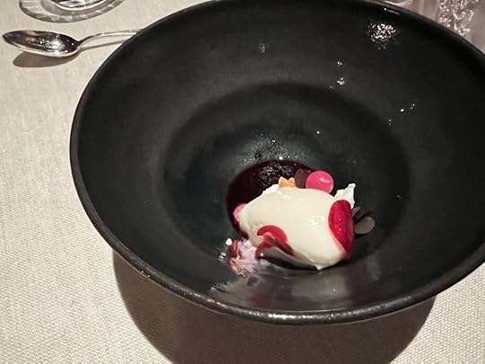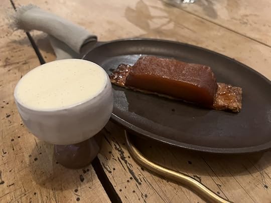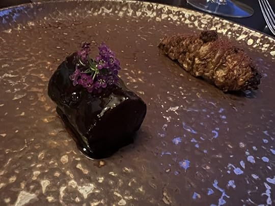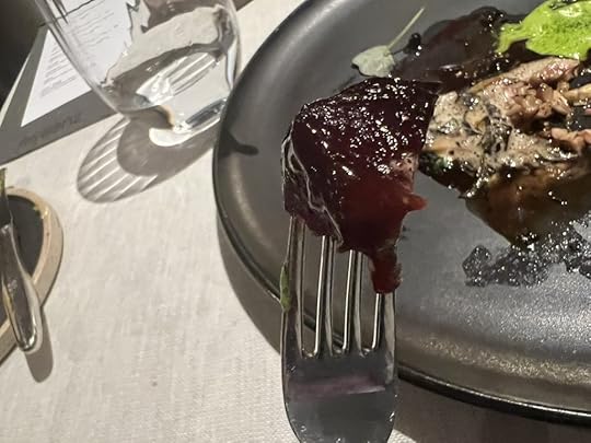 The fourth course, which we both chose, was Kid Goat Ribs with Pointed Pepper, Elderberries and Grapefruit. It was accompanied by a Envínate Migan Tinto from the Canary Islands, vibrant, fruity and minerally.