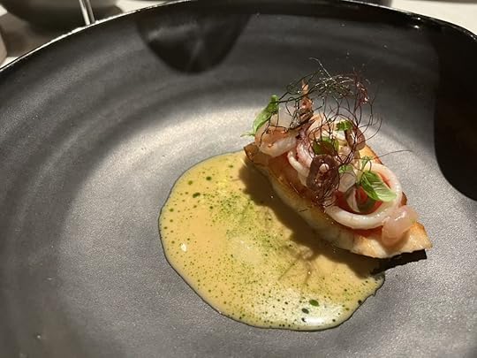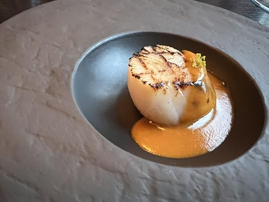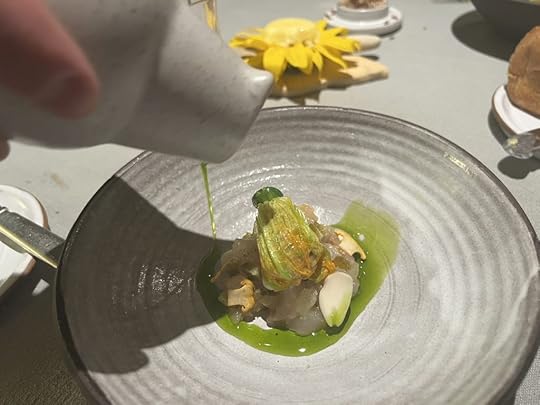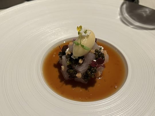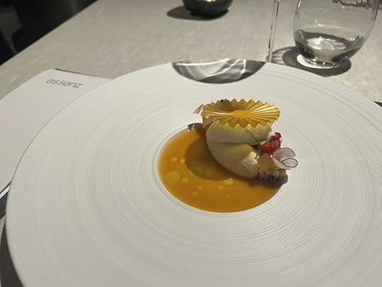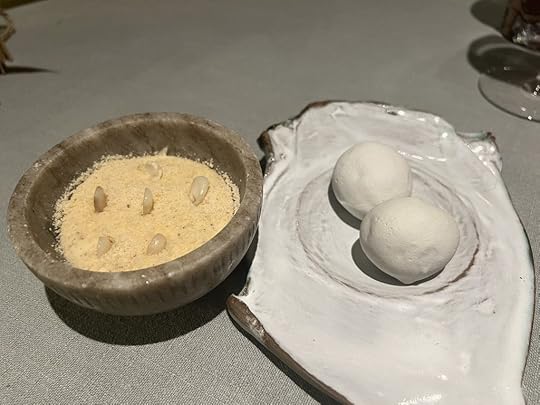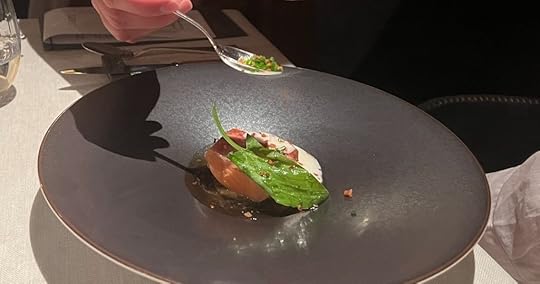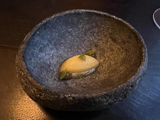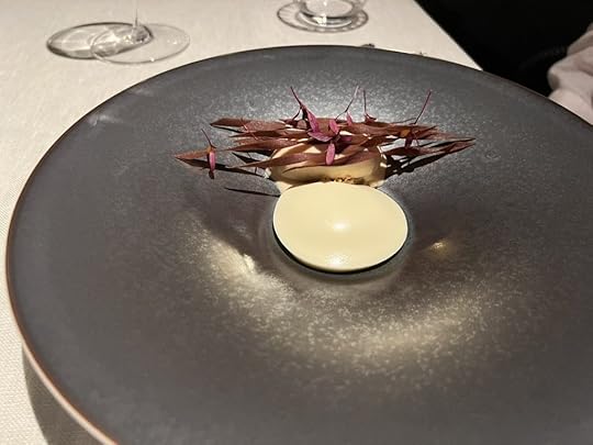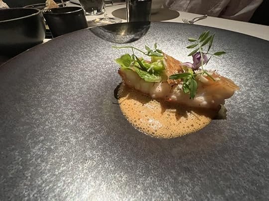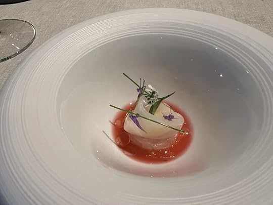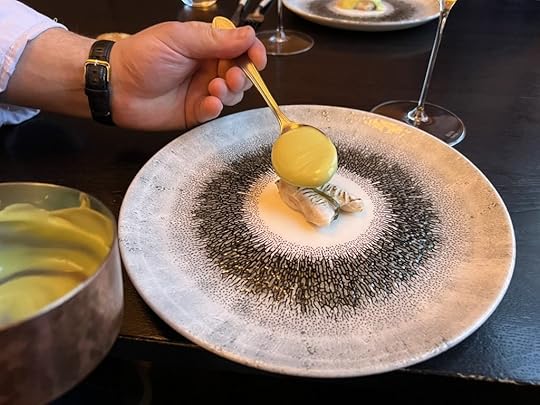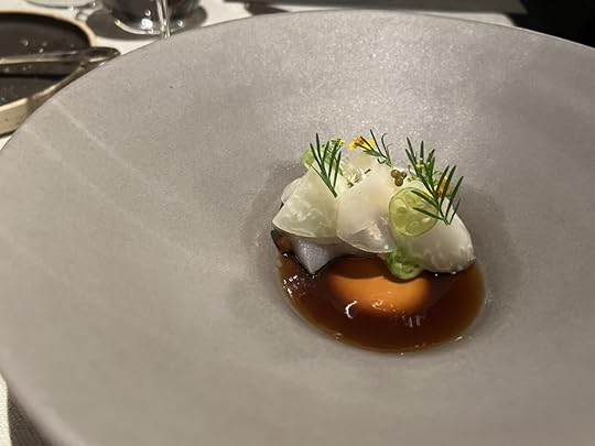 For the next two dishes, the sommelier poured a 2021 Wechsler Morstein Riesling GG, dry, highly concentrated, floral with a long intense finish.