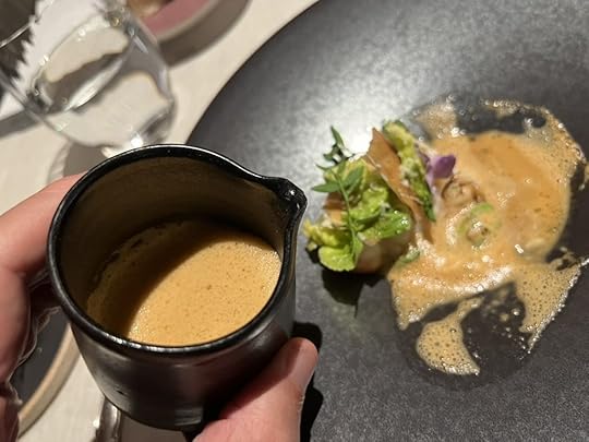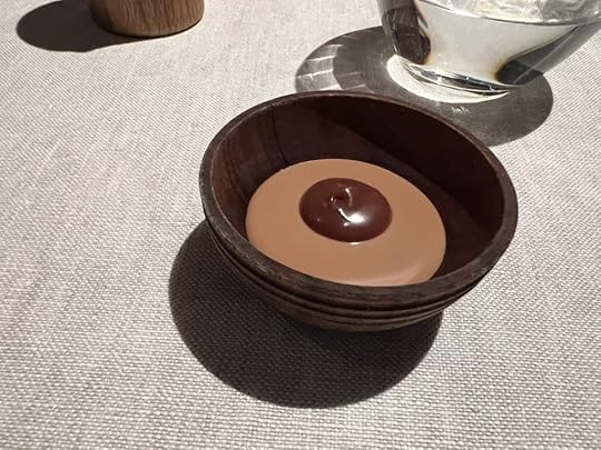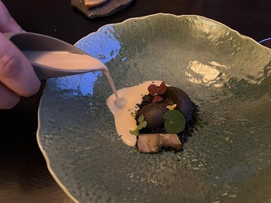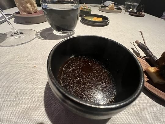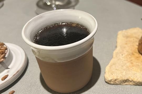 As a sort of epilog to the story told by the complex duck dish, the chef gave us a little cup of consommé made out of the grilled duck bones infused with matsutake mushroom and pine needle oil. Its depth of flavor made it a fine closing statement.