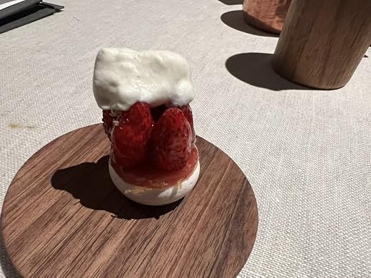 The dessert was described as Seewinkler Mieze Schindler, champagne granita, begonias. Mieze Schindler are a treasured variety of strawberry grown by the nearby Seewinkler group of small farmers. They have that intense flavor of wild alpine strawberries that is sadly lacking in commercially available berries. They are so beloved in Burgenland that it was thought unnecessary to mention on the menu that they are strawberries. Alain Weissgerber featured local ingredients in every dish of this menu, and it’s fitting that he concluded it with a local delight that is so fragile that it doesn’t travel beyond the area.