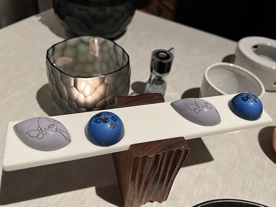 Petit fours were polar bear gummies of black koji and elderflower, and in the whale’s mouth, pralines of plankton, cloudberries and lavender. The swirling colors of the pralines were said to represent the northern lights that we saw that night.